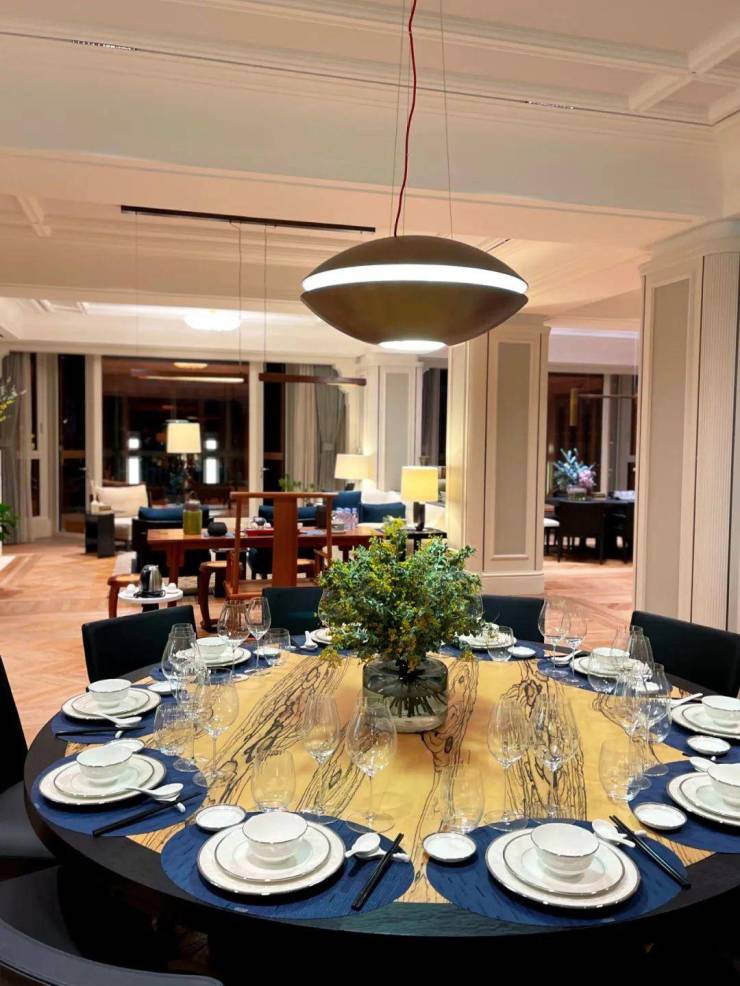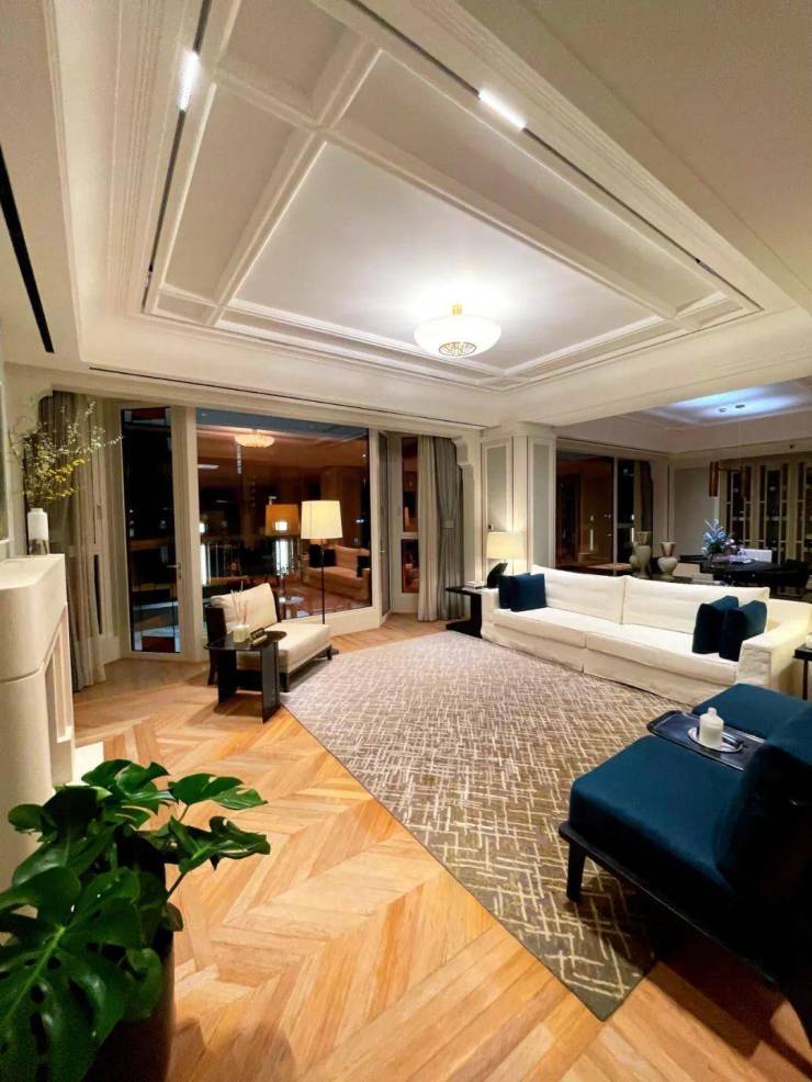 针对高端客群推出的D户型(建面约185㎡),采用罕见的“双主卧”设计,南北双套房均配置独立卫浴与衣帽间。中西双厨系统配备嘉格纳蒸烤箱与全屋净水设备,餐厅区域预留了2.8米长岛台。客厅面宽达7.2米,搭配全景落地窗,部分单元可实现“三江并览”(黄浦江、苏州河、虹口港)。据开发商透露,该户型层高达到3.15米,吊顶后仍保持2.8米净高。