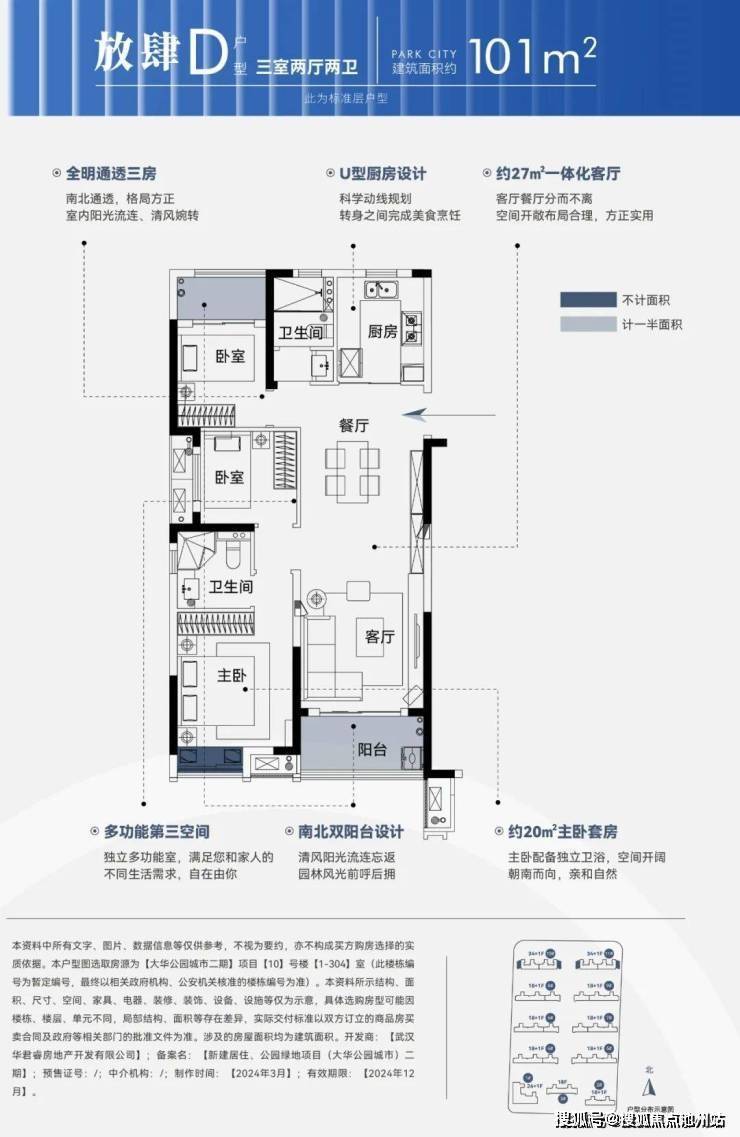 建面约101平,三房两厅两卫: