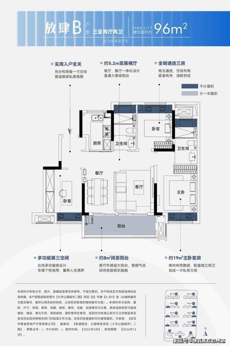建面约96平,三房两厅两卫: