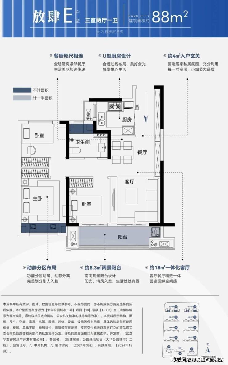 建面约102平,三房两厅两卫: