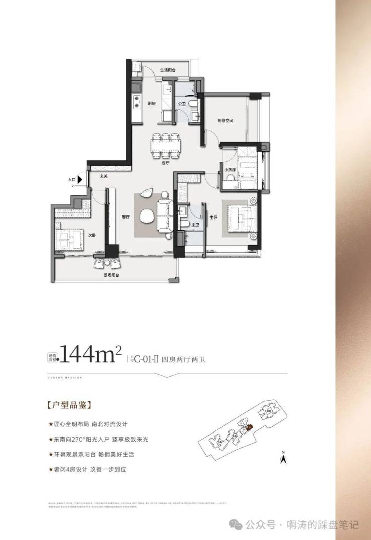 东南向270°阳光入户,南向4.2米峯景阳台
