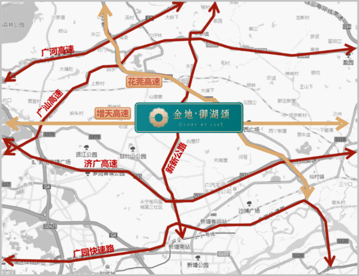 △ 项目周边6条高快速路链接湾区:济广高速、增天高速(预计2025年开通)、花莞高速、广园快速、广惠高速、广深高速等