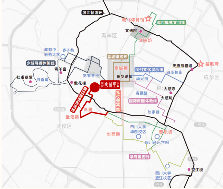 宽窄巷子、青羊宫、武侯祠等世界知名景区林立,人民公园、成都博物馆、省图书馆等文化、休闲配套环伺。千万级游客量(数据来源 :青羊商务公众号)为项目产品提供了丰富的运用场景和源源不断的财富动力。