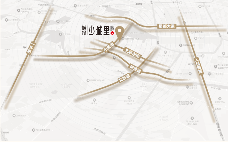 项目位于城市内环青羊区,为“中优”战略重点实施区域,新城、源城双擎发展;板块地处蜀汉博览乐活线及青羊区中优区域规划重要单元,北连皇城坝,祠堂街,南连武侯祠、宽窄巷子等,聚集成都市区优质文游资源,教育资源,未来片区还将构建天府文化公园,打造文博创意集聚区和金融高端商务集聚区。