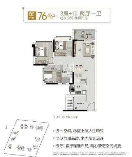 76㎡:3房+1空间2厅1卫