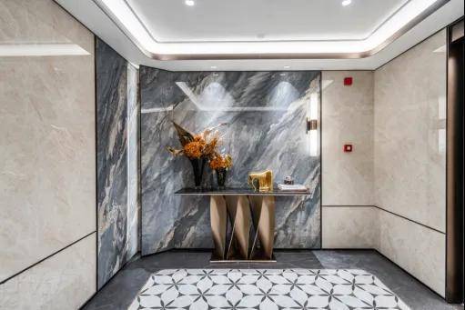 入户大堂:蓝金沙岩板,金色脉络与深蓝色基调交相辉映,平添了一份奢华与神秘的美感,带来一种遨游宇宙的感觉。