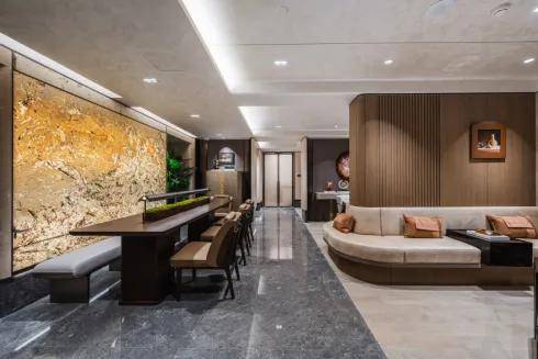 大堂内部,蓝翡翠异形接待台,立于海纳百川七彩奢石背景墙前,历久弥新的奢石传递不朽价值,以自然鬼斧造就的独特纹理及富有韵味的通透质感,见证光与美的相得益彰,这是对潮尚生活的引领,也是一次对美与秩序的坚持。