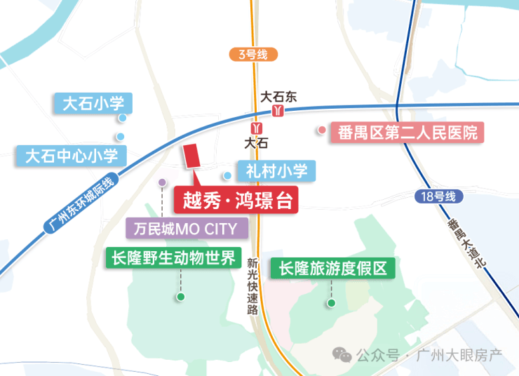 广州城际大石东站,2站琶洲、3站金融城,与3号线双轨交汇。临近26号线群贤路站(规划中,首次环评已通过),5站客村,6站珠城,与3号线平行有效分流通勤(测数据来源于百度地图,仅供参考)