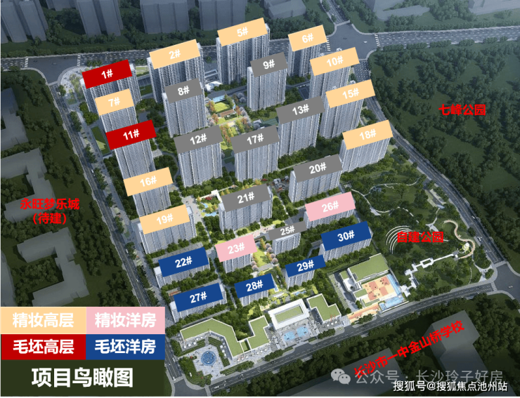 项目位于长沙市一中金山桥学校对面,总建面约38.4万方,约2.2超低容积率,40%绿化率,由18栋高层、8栋洋房组成,整体布局沿袭南北中轴对称特点,强调序列感和节奏感,建筑围绕中心景观布局,保证家家户户优良观景视野。
