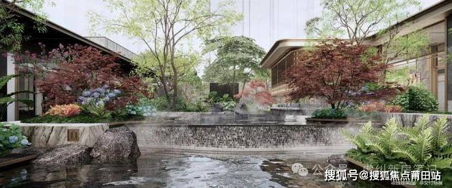 ▲环绕式花园会客厅,特选乔木,叠瀑景墙