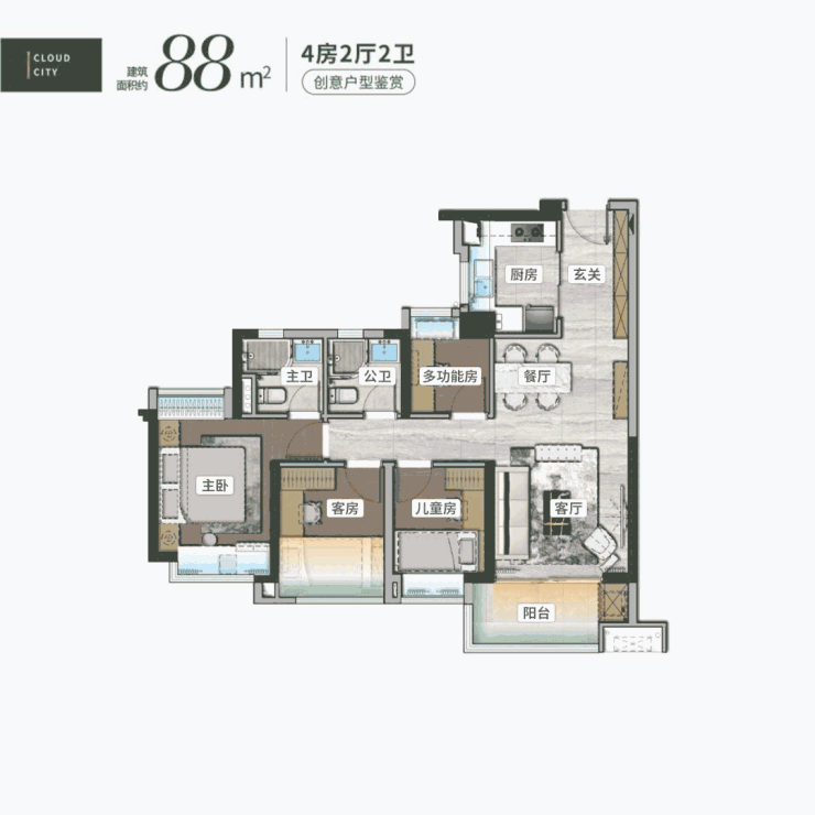 建面约88平户型,则是建面约105平户型的缩小版,配置直追市面上一些100平以上的四房。