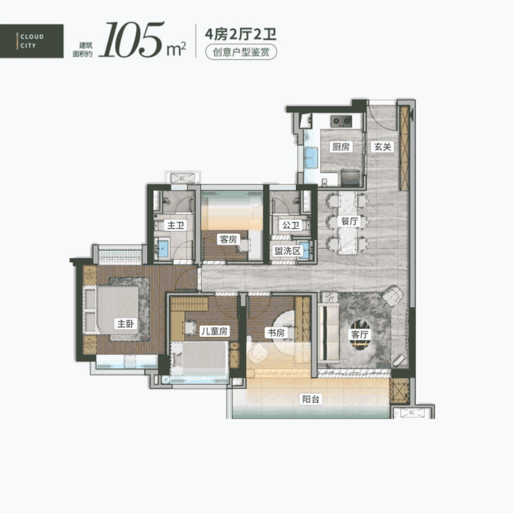 首先来看下这个建面约105平四房户型,你就知道什么是硬核。
