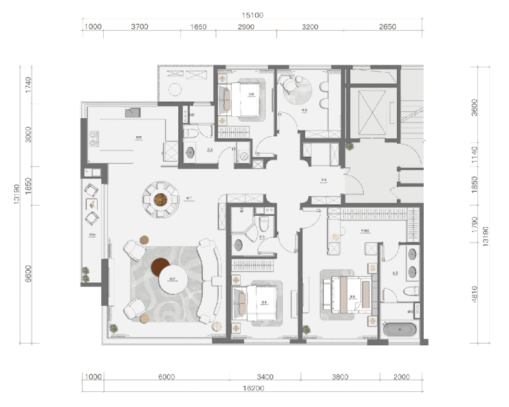 当莲花山、韩仓河的稀缺生态成为不可复制的自然亲密,如何让这独有的山河之美与空间的奢适相映成趣,凤栖和鸣210m²给出了完美的答案。270°的环幕客厅,以无柱设计,形成一幅巨幕,让自然的山水诗意毫无保留的映窗入境,身在其中如入画境,无论是晨光初照的朦胧之美,还是夕阳余晖下的温柔治愈,这种直面自然的惬意,赋予空间更优雅的活力。270°山河入境的无界视野与约70m²的LDKB设计,打造更加尊崇的家族社交场,会客雅聚,畅谈天地。
