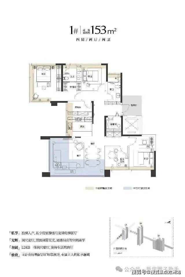 该户型为1号楼16-28层西边户,在153户型基础上增加了西侧家政间和北侧卫生间等面积,高区和低区做成了不一样户型。主卧做到了三面全景落地窗,客厅也有西南向270度的景观视野。该户型是本项目的王炸户型,即可以保证采光,也有不错的江景。