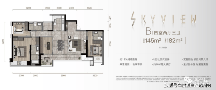 B户型 建面约183㎡ 套内约145㎡ 总价450-520万(四室两厅3卫)朝向:南