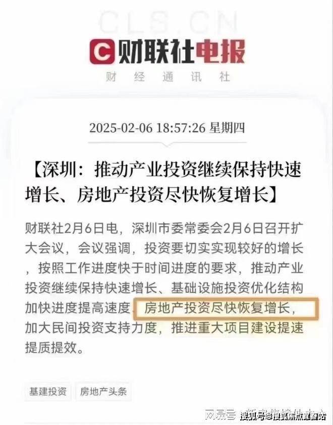 财联社2月6日电,深圳市2月6日召开扩大会议,会议强调,投资要切实实现较好的增长,按照工作进度快于时间进度的要求,推动产业投资继续保持快速增长、基础设施投资优化结构加快进度提高速度、房地产投资尽快恢复增长,加大民间投资支持力度,推进重大项目建设提速提质提效。