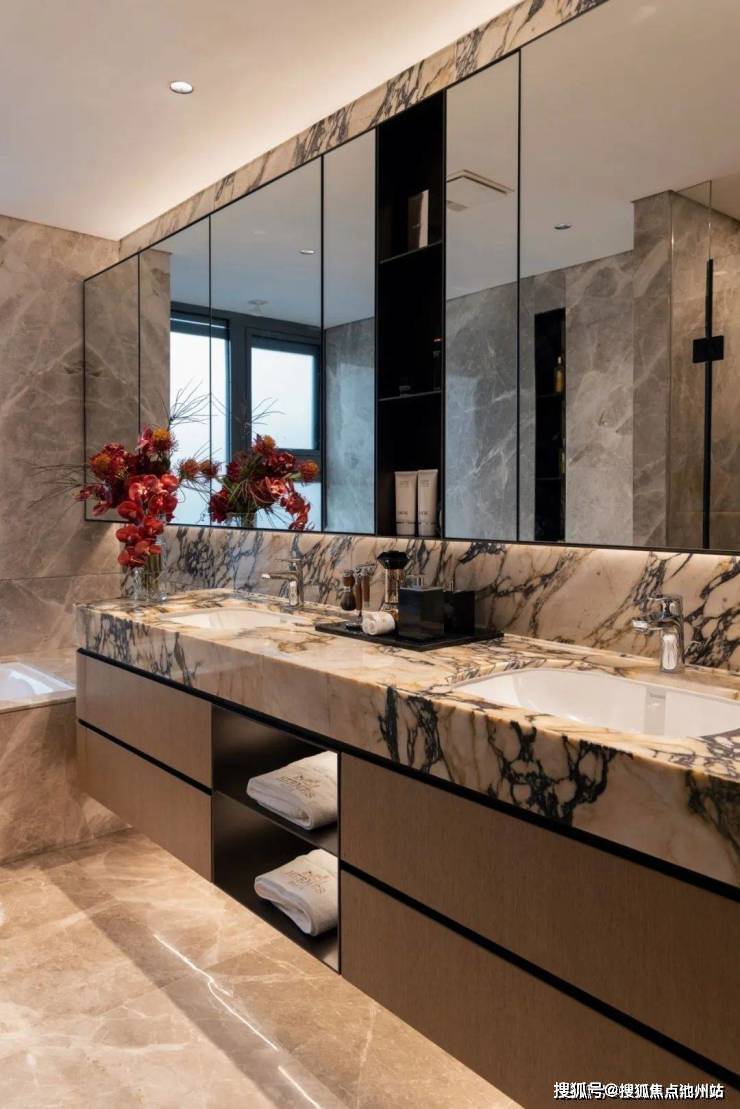 进口「宝格丽」奢石的浴室台盆、背景墙,采用整料厚材的一体化工艺,甚至连不起眼的壁龛内部,也是奢石。
