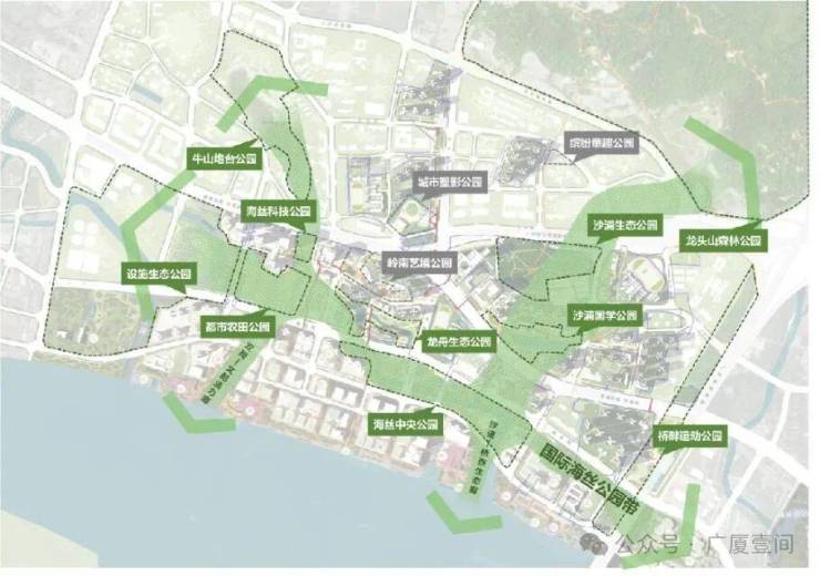 9个特色主题公园:海丝科技公园、都市农田公园、岭南艺境公园、沙浦国学公园、城市塑影公园、缤纷童趣公园、龙舟生态公园、远洋文化公园、桥畔运动公园。