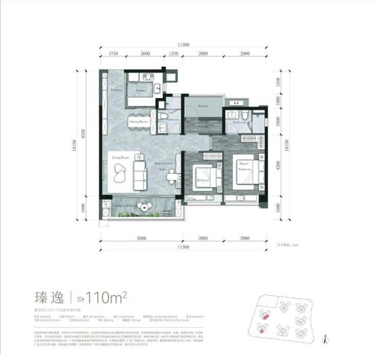 建面约𝟏𝟏𝟎m²户型【可改四房】,全开间朝南 约𝟏𝟏.𝟑米南向采光面
