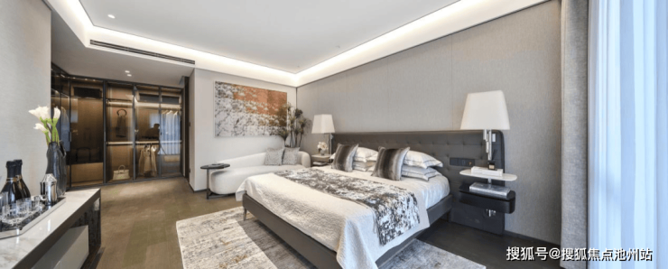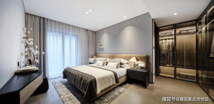 或许考虑到业主存在与父母同住的需求,于是古翠隐秀规划了双主卧套房。约37㎡星级酒店式主卧套房,附带约8㎡独立衣帽间和主卫,成为男女主人的独立起居天地。