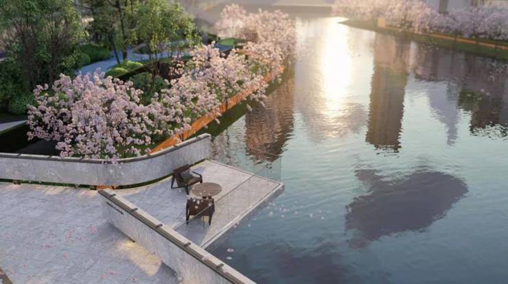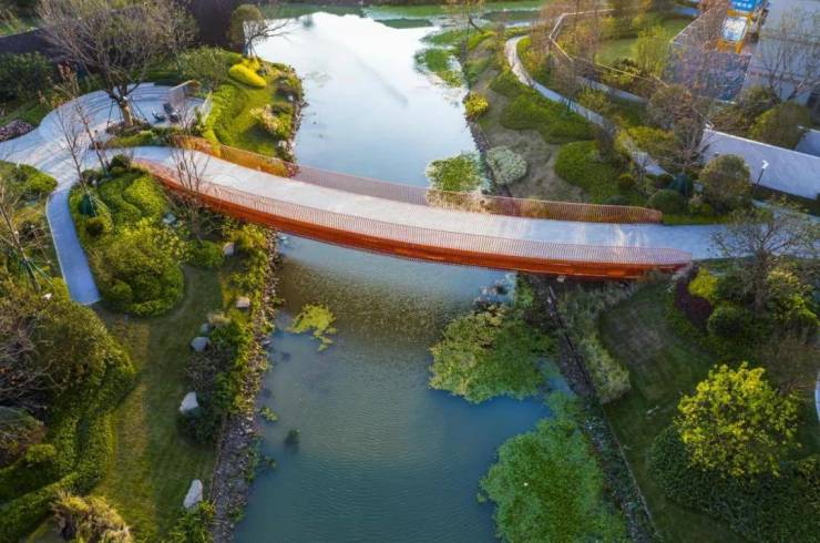 国贸地产代建了一座约1.8万方的滨河市政公园,而且三座岛屿社区都有不同的主题,并设置了非常丰富的景观节点。由于2条天然水系的存在,整个社区可以被环绕成一个紧密的小型生态系统,有效地形成一道环境保护屏障。同时,每块土地以及组团都可以拥有独特的水系景观,让人眼前一亮。一旦从小区入口进入,从外部延续而入水系美景又将与生活场景、活动空间有机结合,景观设计既有质感又不失烟火气。