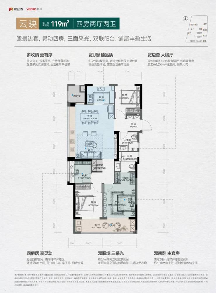 若是三房不够住,建面约119㎡的户型则在面积和功能上做到完美的平衡。