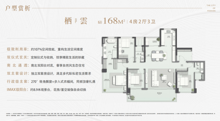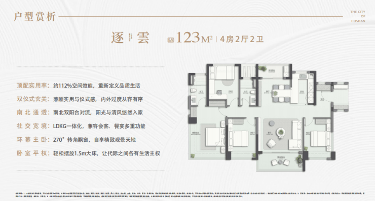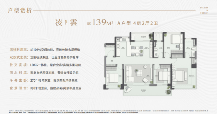 产品设计:高赠送阳台(约 30%),LDKG 一体化宽厅,使用率约 106%-112%。