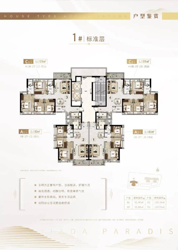 项目在售1栋园景楼王,两梯四户,户型有93㎡的3房以及129㎡四房,户户单边位。