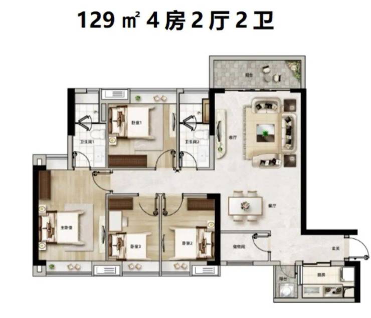 产品主打93-129㎡三至四房,精装交付省心省力,容积率仅2.2、绿化率36.6%,低密宜居。社区规划7000㎡园林,2梯4户布局,户型方正通透、南北对流,双阳台设计兼顾实用与观景,部分户型赠送面积可观,实用率突出,动静分离设计,兼顾居住舒适度与实用性,满足不同家庭需求。