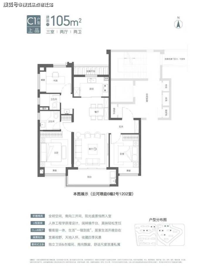 建面约105㎡3房2卫有宽厅和竖厅两种风格,其中宽厅户型好评度颇高。