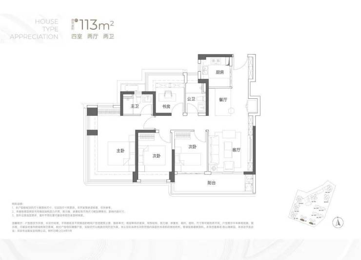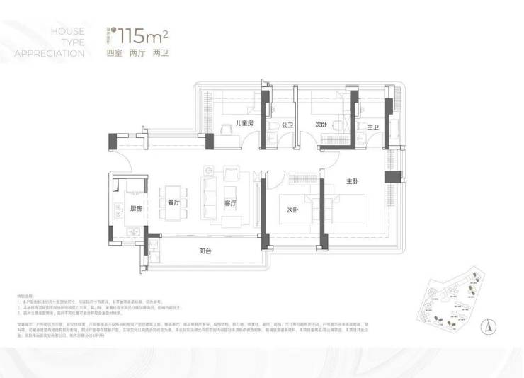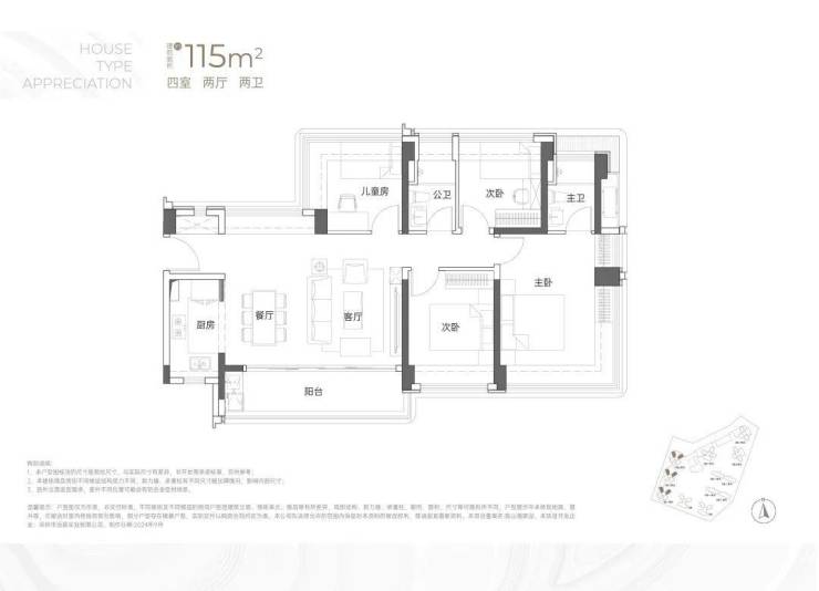 竖庭格局,西南向,基本居住功能与建面约108-110㎡4房2卫一致,但格局不一样,从目前公布的户型图上看,主要是主卧空间有了更大的提升,比如可以放更大一点的衣柜。但从位置上看,它所在的楼栋更靠近主干道,会有噪音影响。