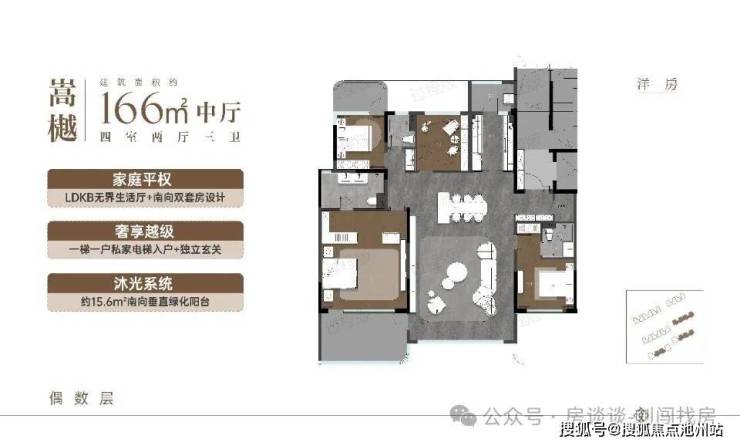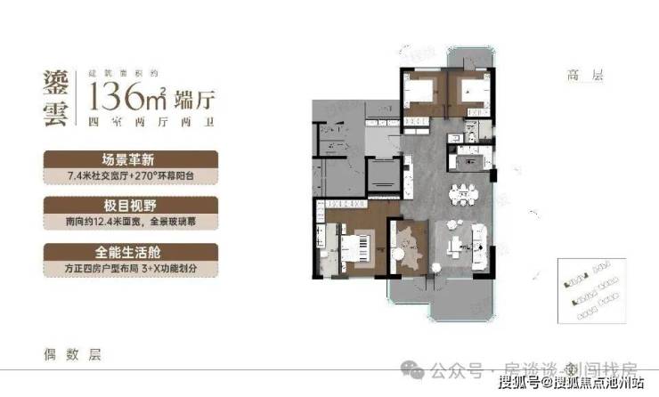 高层:136㎡四房,环幕端厅设计(边户客厅开间 7.3 米),奇偶错层小露台,精装交付