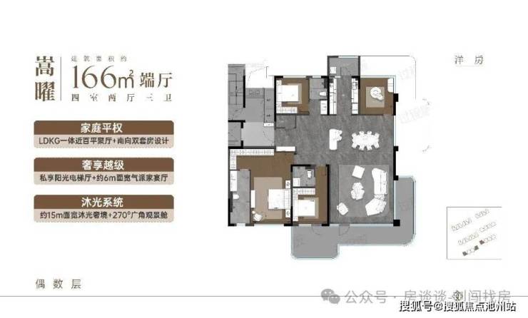 洋房:166㎡四房,270° 环幕端厅 + 双露台,部分楼层带地下室或复式,精装交付
