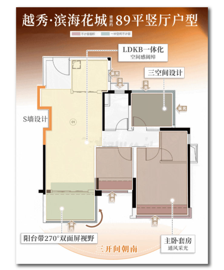 建面89平的户型,项目做了三个270°视野(景观阳台、主卧和次卧),并且还是三空间带主套。