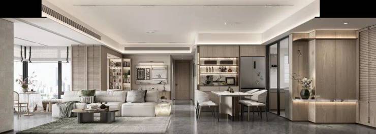约100平阳台做到270°视野,还设有餐边飘台,既能扩大室内景观面,又增加了收纳和赏景功能。