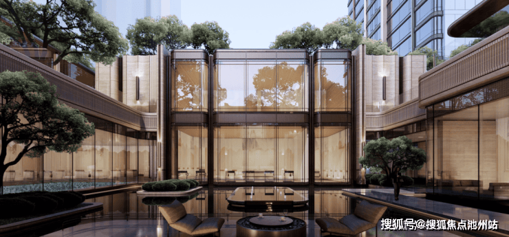 江屿镜庭以“江中有岛、岛中有湖”的江心屿为设计灵感,整个景观以温州首个单侧悬挑风雨连廊串通,透光云石、乱纹古铜金铝板在光影交织中勾勒出空间的奢华质感与匠心精神。