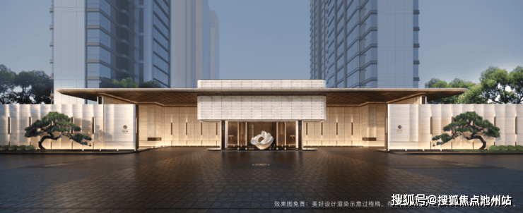地面铺装石材带着独特纹理,行走其中,好似波纹渐起。两株名贵造型罗汉松分列左右,如同优雅的迎宾使者,以苍翠之姿邀您入内。