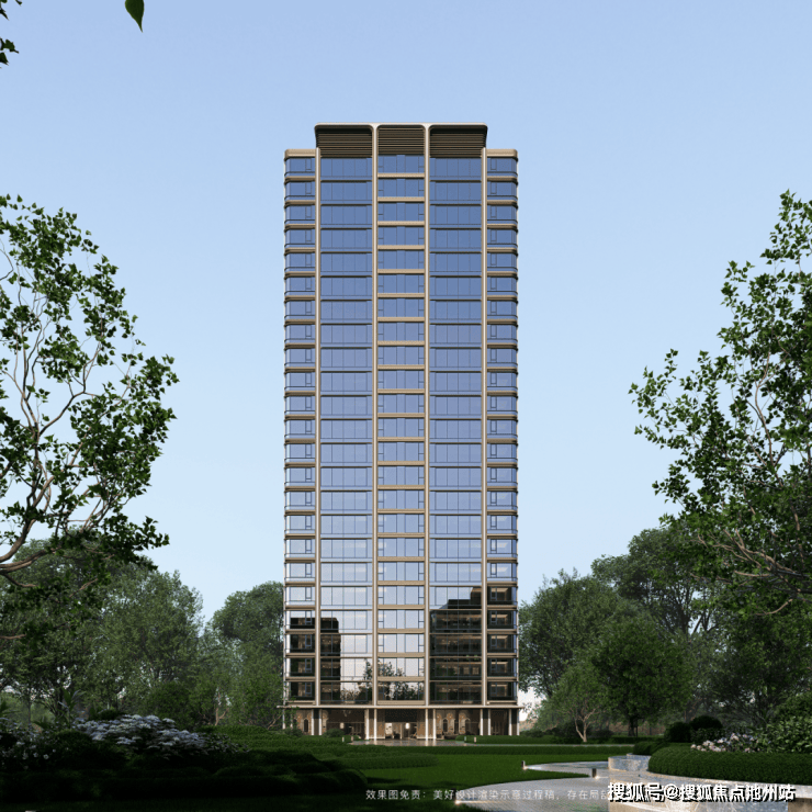 高层楼幢以大面玻璃+香槟金色铝板为立面主建材,金色线条从顶冠向下延伸,勾勒出建筑的挺拔轮廓,彰显出简约而现代的视觉冲击力。
