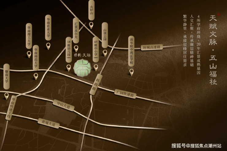 教育配套:项目自建18班幼儿园和45班九年制中小学、目前该校已官宣引入广东实验中学教育集团办学,由广东实验中学派出团队管理。周边有211高校荟萃、多所省一级资源