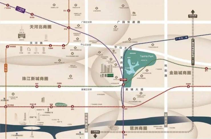 20分钟内可抵达环市东、珠江新城、北京路、白云新城等主轴商圈,周边环伺太古汇、万菱汇、正佳广场、天河城购物中心、ICC环贸天地等大型综合商业,满足多元消费需求。
