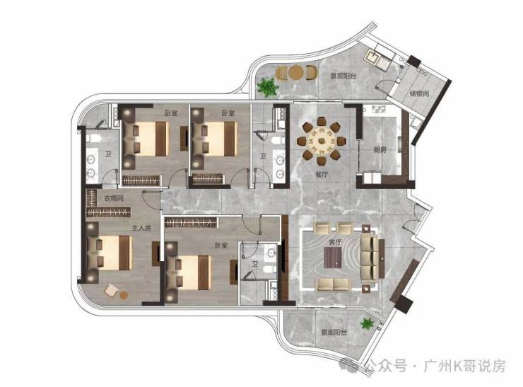 云起兴泰85-135㎡奢装洋房产品户型均为高拓展面积户型,入户花园、阳台、飘窗、卧室、露台等均有赠送空间;可随心打造成多功能百变空间,满足居者使用需求;推窗更可饱览水岸优质景观,为室内平添绿意。