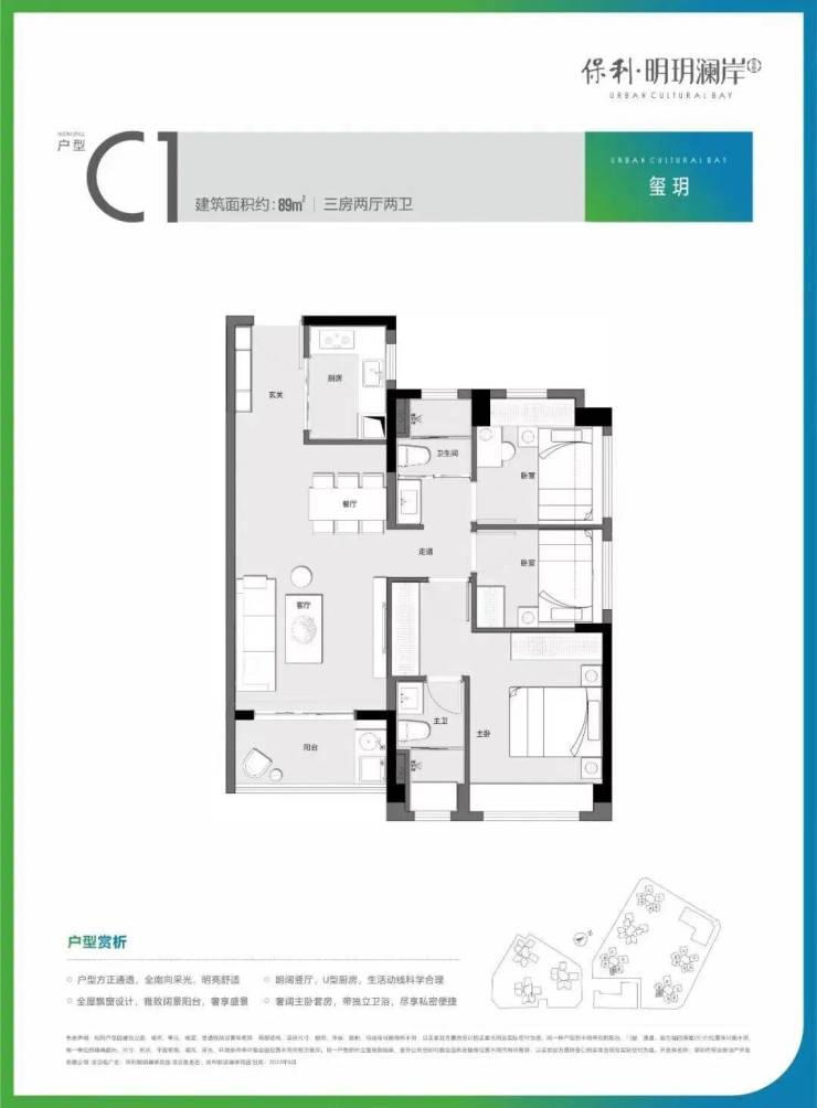 89㎡的3房2厅2卫,设计的是竖厅格局,客厅3.5米开间,LDKB一体化设计,进门独户玄关,动静分区,主卧大套间,U型厨房,公卫三段式分离设计,得房率:75.6%(不含赠送),阳台有西南向、东南朝向或朝正南向
