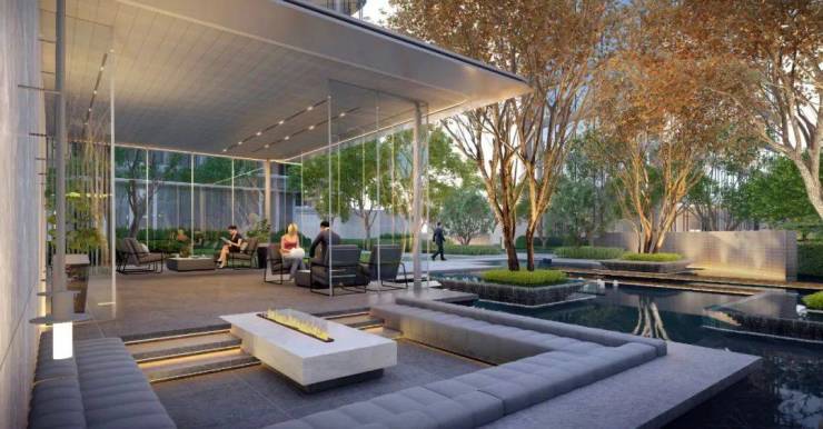 园区的景观灵感,来自于曼谷豪宅EssAsoke,以双中庭为核,由轩敞的风雨连廊,串联起悬浮会客厅、叠水树景、24小时封闭式轻氧健身仓等社交空间。