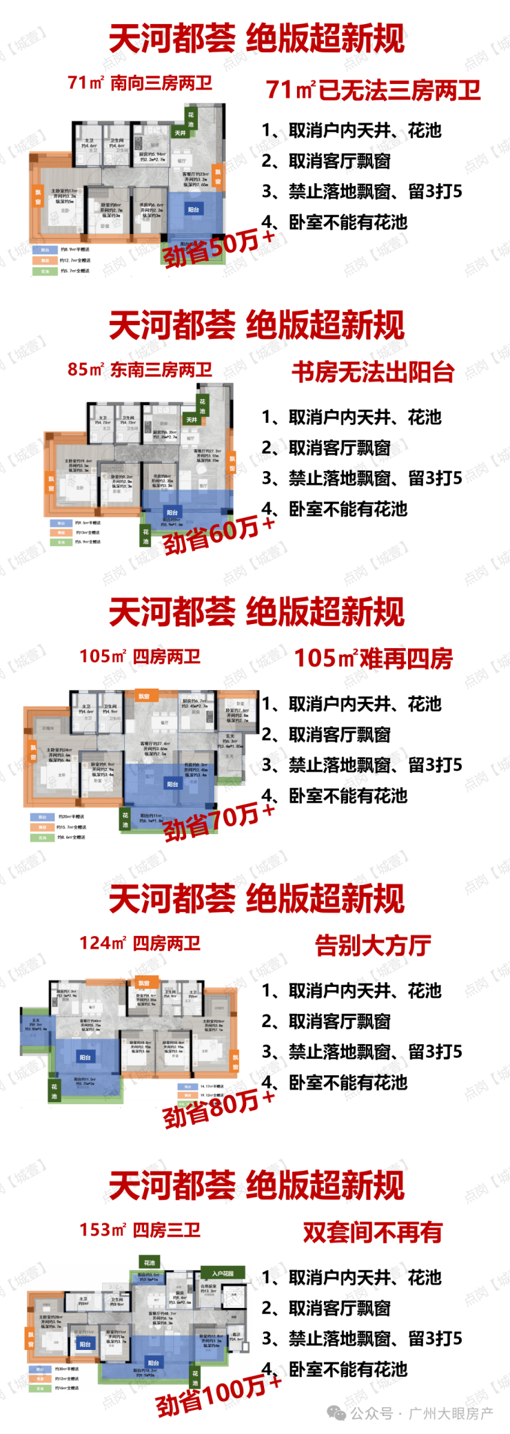 据了解,珠江天河都荟项目首推北地块,容积率2.0,一共4栋,两栋小高层(13-14F,2T2),两栋高层(24F,2T5),货量284套,户户朝南,超宽楼间距。