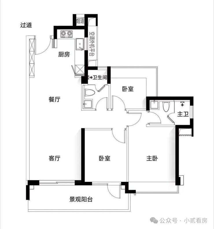先来看约96㎡三房户型,做到了三开间朝南,阳台也有高达6米的开间,那么采光和通风就不成问题。