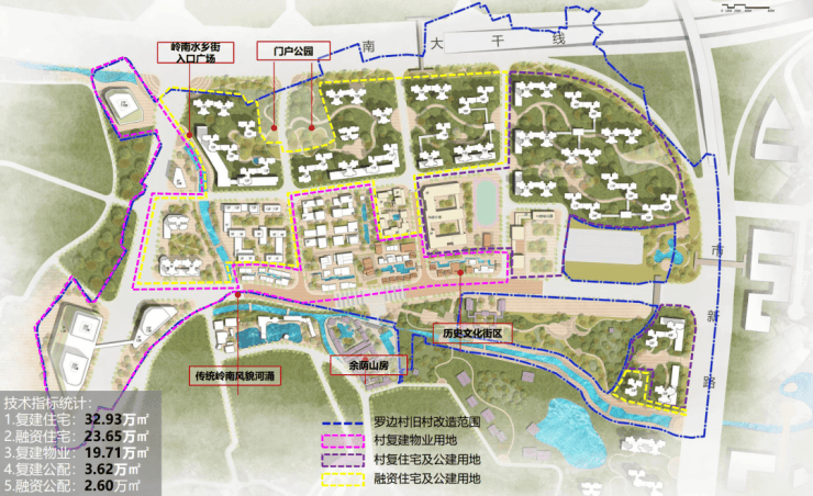 罗边村旧改100万㎡里,包含了32.9万㎡的安置住宅,以及23.7万㎡的融资住宅区。剩下的面积都是商业、教育等其他配套。在这其中,还包含了一条面积1.6万㎡的商业街,和3.9万㎡的岭南风情商业街。