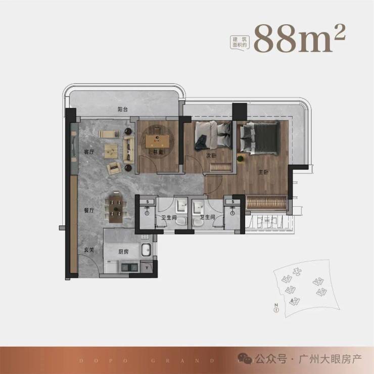 88㎡户型,约5.7M巨幕阳台 | 270°环幕瞰景主卧|LDKB一体化设计