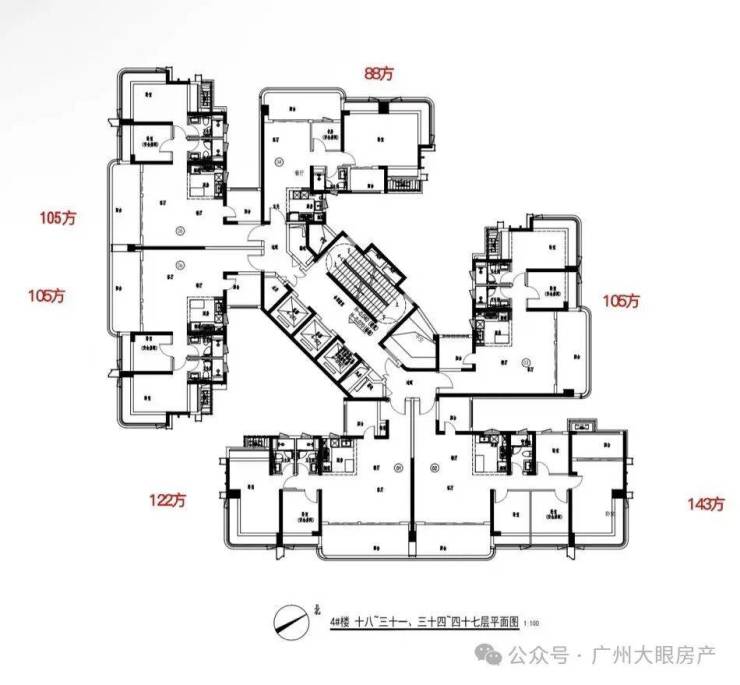6个户型,朝向分别为:88平朝西北,2个105平朝西南,122平和143平朝东南,还有一个105平朝东北,不分户型大小,全都是3.05米层高