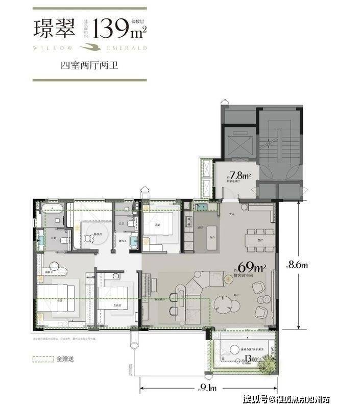超大赠送面积(不计产权面积)+电梯前室拓展面积,139㎡最大综合建筑得房率达到136%,相较于传统的第三代住宅多近53平,整整送出了一套小户型房子,妥妥190+㎡大平层级别的享受。