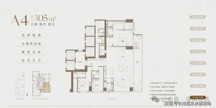 户型起步都是四房三卫或以上的设计,非常豪奢。未最终测绘,仅供参考,最终户型面积以官方输出为准。